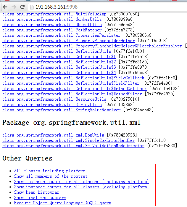 注意如果Dump文件太大,可能需要加上-J-Xmx512m这种参数指定最大堆内存,即jhat -J-Xmx512m -port 9998 /tmp/dump.dat。然后就可以在浏览器中输入主机地址:9998查看了: