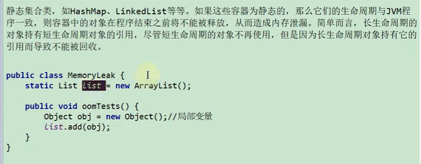 Java中静态集合类有hashmap, linkedlist, arraylist.而静态集合类的生命周期与jvm程序一致。如下例中obj对象被add到静态集合类arraylist中,所以就算obj不再使用也无法释放内存