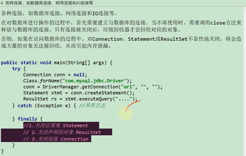 在对数据库进行操作的过程中,首先需要建立与数据库的连接,当不再使用时,需要调用 close 方法来释放与数据库的连接。如果对 Connection、Statement 或 ResultSet 不显性地关闭,将会造成大量的对象无法被回收,从而引起内存泄漏。