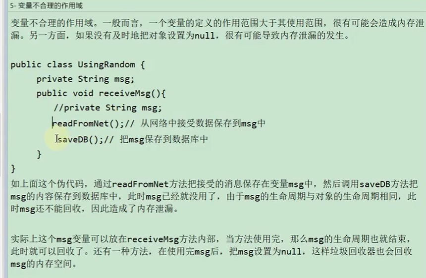 如下例中msg是成员变量,其作用域与UsingRandom对象生命周期相同,就算其在接收readFromNet后不在使用也不会被回收