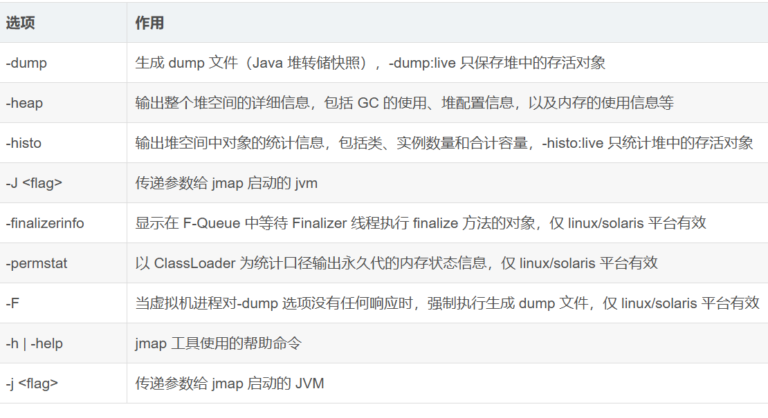 - jmap:用于生成堆快照,此外还可以查询finalize执行队列,java堆和永久代使用情况,比如空间使用率,使用哪种垃圾回收器