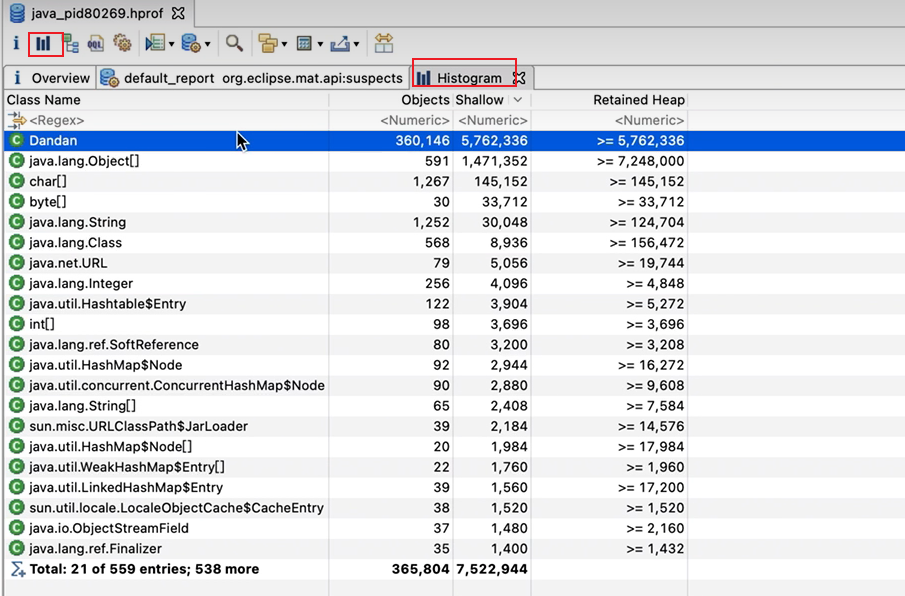 ② 定位大对象:点击直方图图标(Histogram),对象会按内存大小排序,查看内存占用最大的对象;