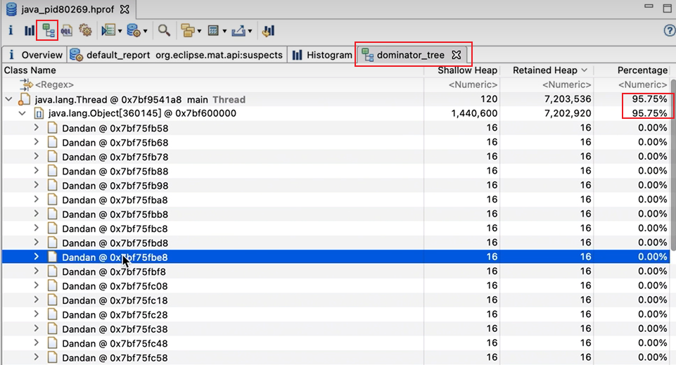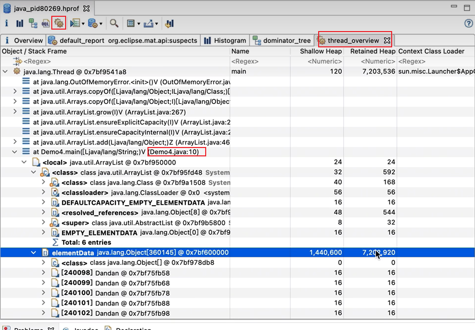 ③这个对象被谁引用:点击支配树(dominator tree),看大对象被哪个线程调用。这里可以看到是被主线程调用。