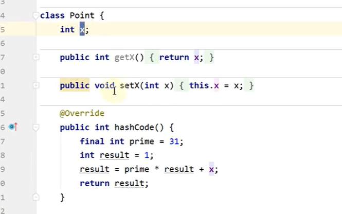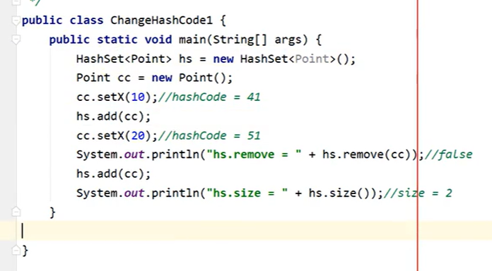如下例中,首先point中有一个属性x参与了hashCode计算,在main方法中首先将x设置为41存入到list中,但紧接着将这个参与计算hashcode值的x改成20了,这样在hashset中便找不到原来10的值了,执行remove后也不会将存到hashset中x=10的值删掉了