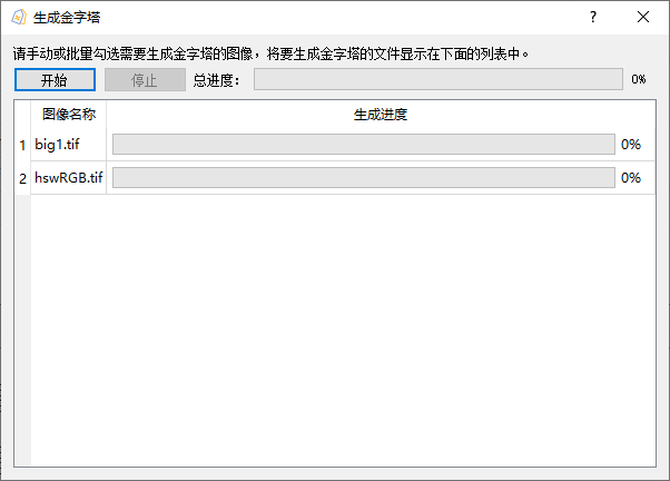 在主界面上,可以选择那些尚未创建金字塔的文件(金字塔已经存在的文件,用绿色标记),或者一次选择一批文件进行创建金字塔。点击按钮弹出创建金字塔的对话框,在对话框上点击"开始“按钮。