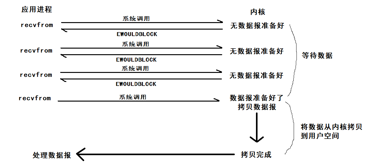 非阻塞的recvfrom系统调用之后,进程并没有别阻塞,内核马上返回进程,如果数据没准备好,返回error,