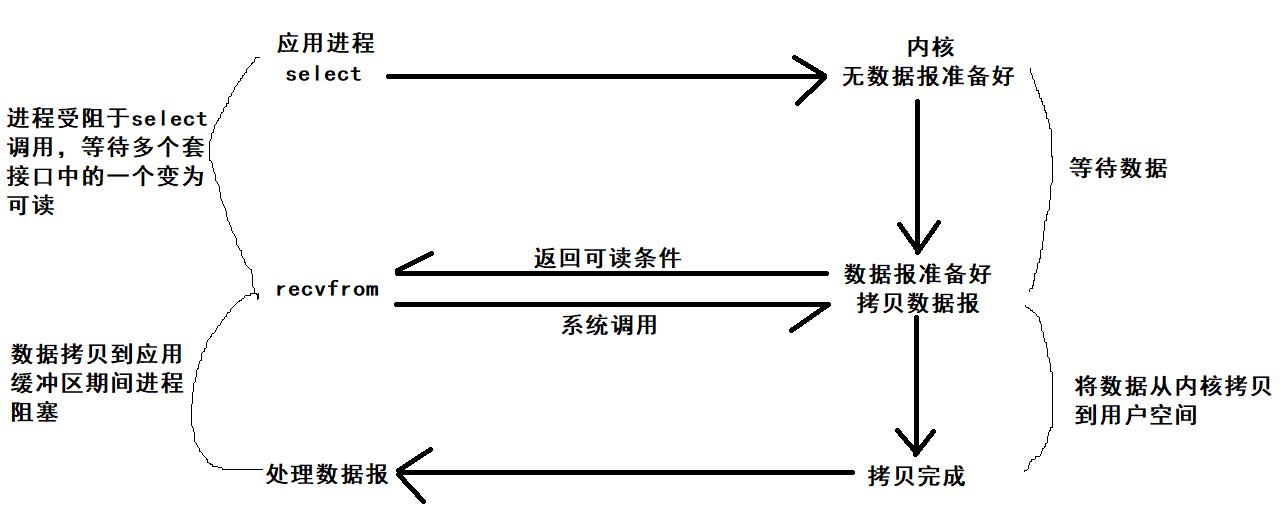当任何一个数据准备好,select就会返回可读。然后再进行recvfrom系统调用。