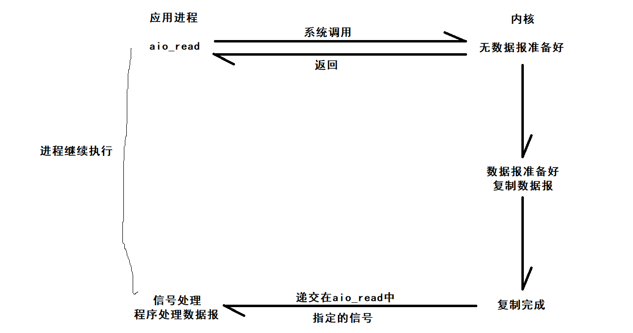- 当内核的数据报就绪的时候,由内核将数据报拷贝到应用进程中,返回aio_read中定义好的函数处理程序