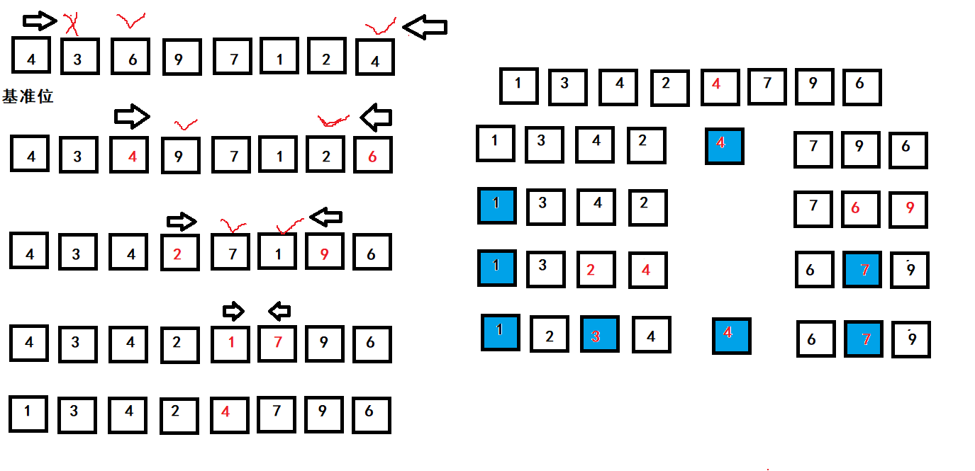 然后将比基准数小的排在左边,大的排在右边。和基准数进行交换,交换完后左边都是比基准数小的,