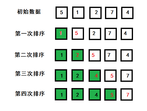 - 从原始数据中选择最小的数字,将其和位于第一个位置的数据交换位置