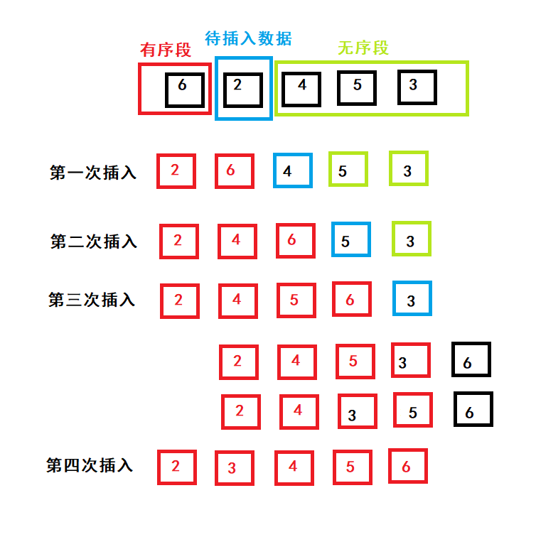 例如这里的第四次插入,3与6先交换,3与5再交换,3与4又交换