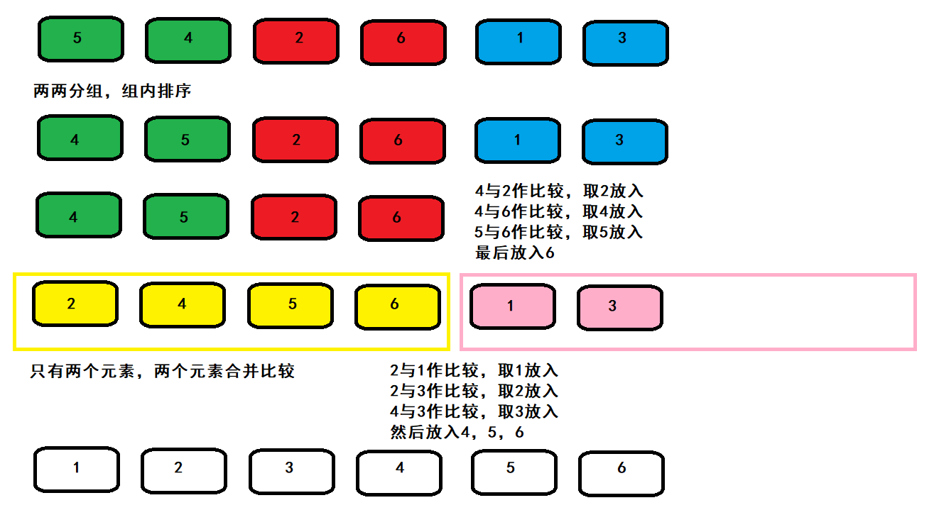 将一个数组的进行两两分组,进行组内排序,排好序后两个数为一个元素,两两元素内的所有数进行比较排序,