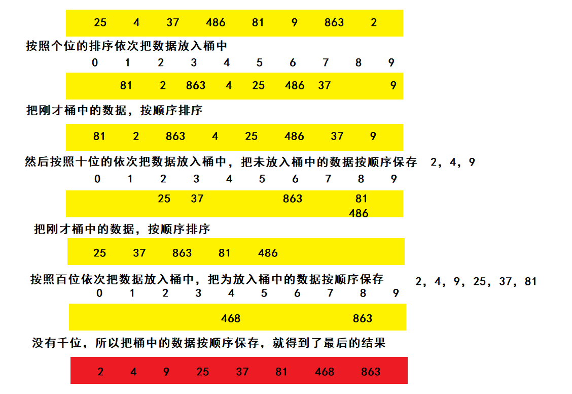 4.重复到没有位数,把保存好的数字取出来就排序好了