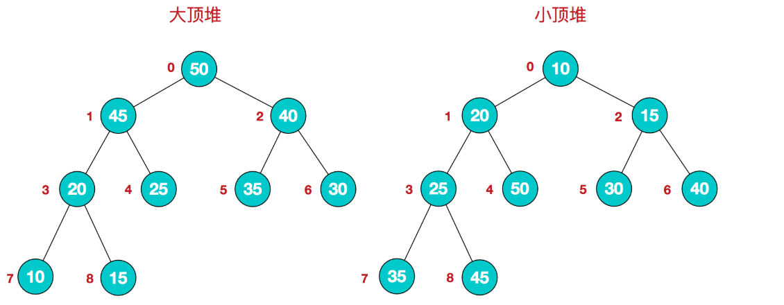 - 堆中某个节点的值总是不大于或不小于其父节点的值;