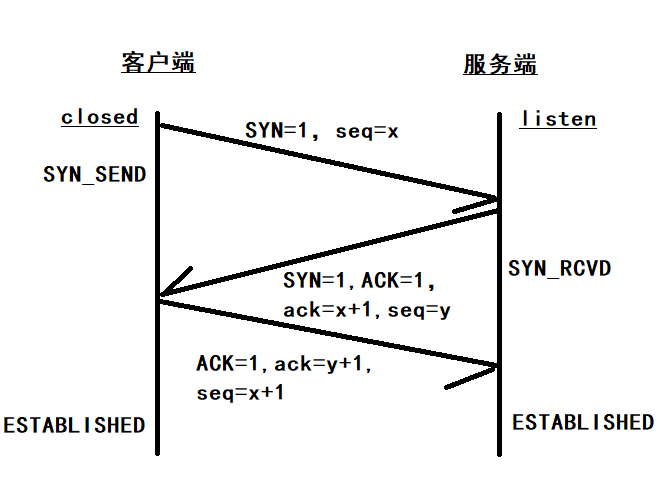 第三次握手:客户端收到SYN报文之后,会发送一个ACK报文,也是把服务器中的ISN+1作为ACK的值,表示已经收到了服务端的SYN报文,此时客户端处于ESTABLISHED状态,服务器收到ACK报文后,也处于ESTABLISHED
