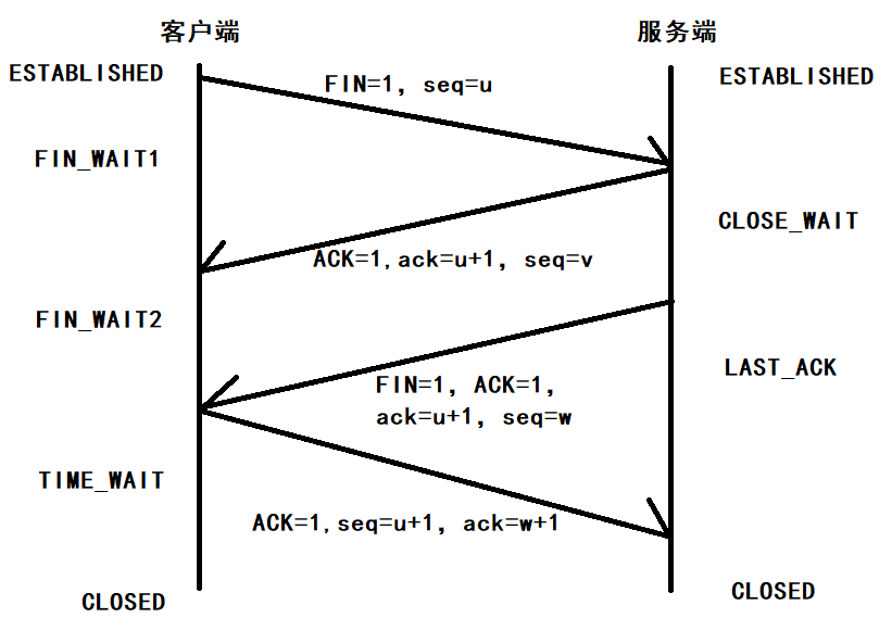 第四次挥手:客户端收到FIN之后,发送一个ACK报文作为应答,同样是把服务端的序列号+1作为ACK报文的序列号,此时客户端处于TIME_WAIT状态。需要等待一会(2MSL),确保服务端接收到报文后进入CLOSED状态,服务端收到ACK报文后,关闭连接,处于CLOSED状态。