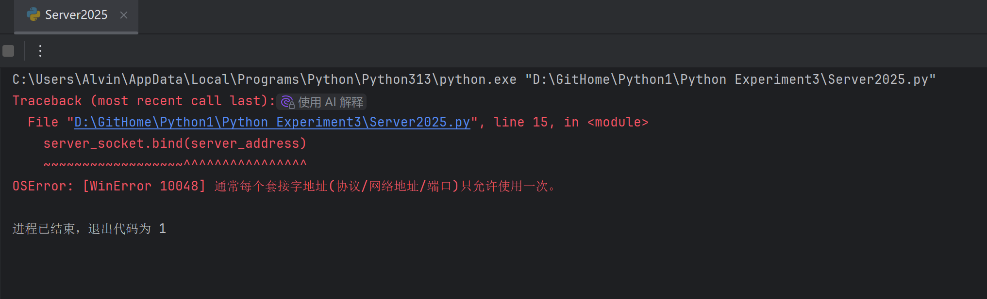 问题1:测试程序时,再次启动服务器程序,发现端口被占用(如下图)