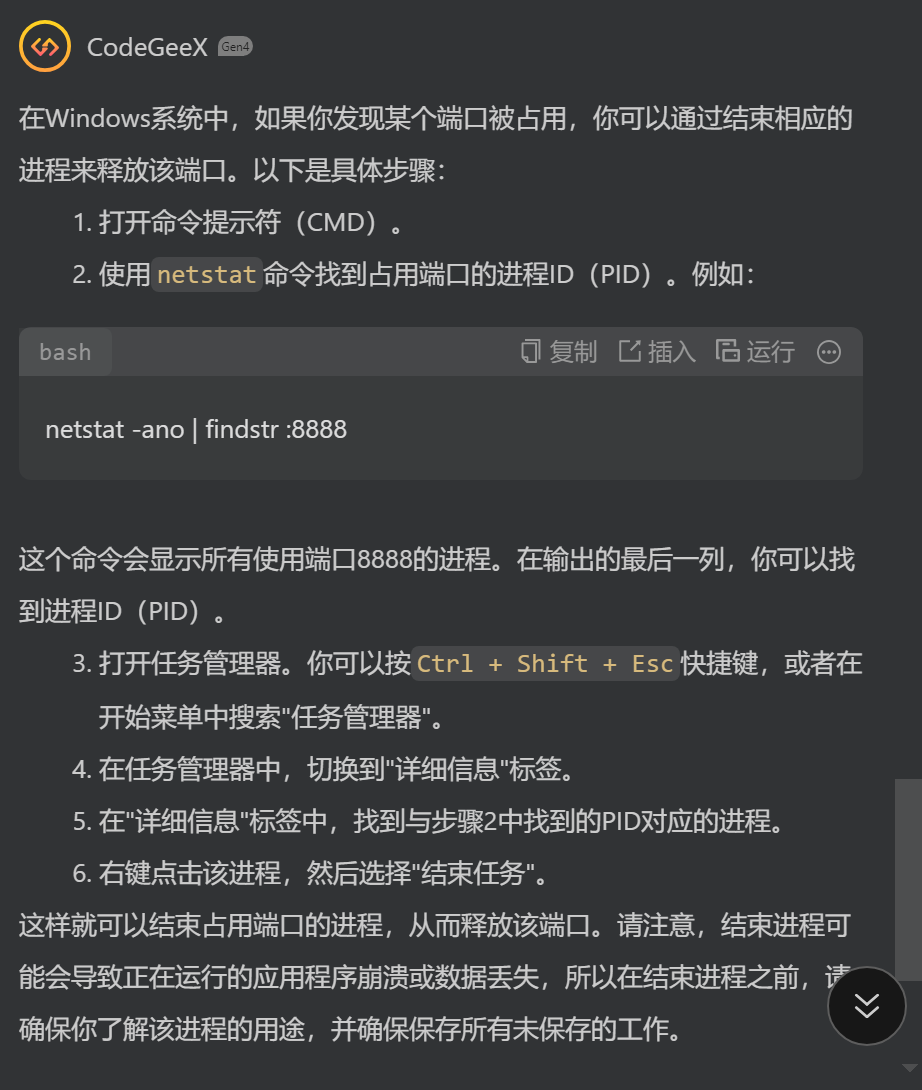 问题1解决方案:询问AI,尝试在CMD中使用netstat命令查找占用端口的进程ID,然后在任务管理器中找到这个进程并结束之(如下图)