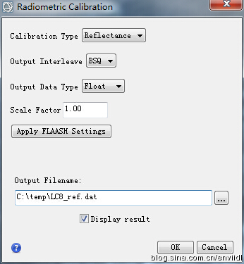 (3) Calibration Type:Reflectnace,选择输出路径和文件名。单击OK执行定标