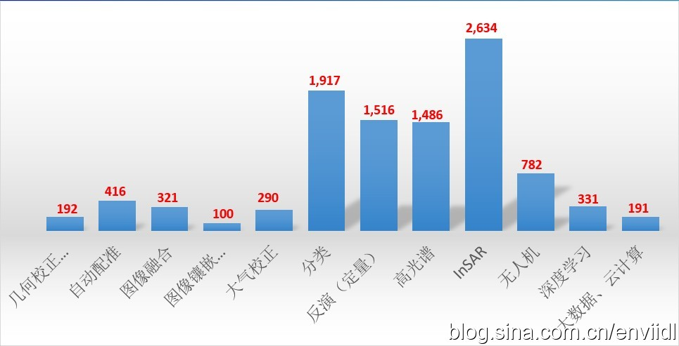 通过检索学术论文库(中文)发现近5年遥感类的研究论文非常多,平均每年有9千多篇。增加其他关键字搜索,得到如下的一张图。可以看到图像预处理环节的文章较少,说明这类技术已经比较成熟;涉及信息提取、定量反演的文章较多,遥感分类一直是遥感领域的“疼”,虽然有时候分类精度能达到80%以上,可是有很多条件限制,这个话题一直是遥感领域的热点;新技术方面,如深度学习、大数据、云计算等方向开始起来,相信未来几年会有更多的研究成果。