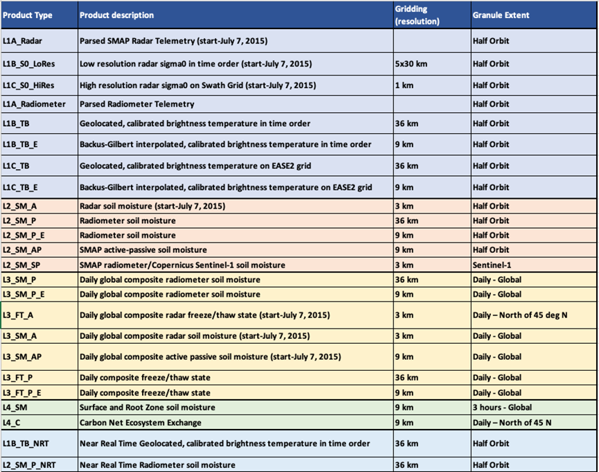 SMAP基线科学数据产品包括以下种类。总的来说,SMAP任务生成了24个可发布的数据产品,归属四个数据处理级别;一级产品包含与仪器相关的数据,以SMAP卫星半轨道为基础,最北和最南的轨道位置划分半轨道边界。二级产品包含基于仪器数据的地球物理反演,也以半轨道形式出现;三级产品是基于二级产品进行地球物理反演得到完整的UTC全球日合成产品。四级产品包含利用SMAP数据进行地球物理模型反演。这些数据产品通过两个NASA指定的数据中心公开提供:阿拉斯加卫星设施(ASF)和美国国家冰雪数据中心(NSIDC)。ASF专门从事SAR数据,NSIDC专门从事冰层科学研究以及陆地微波数据。