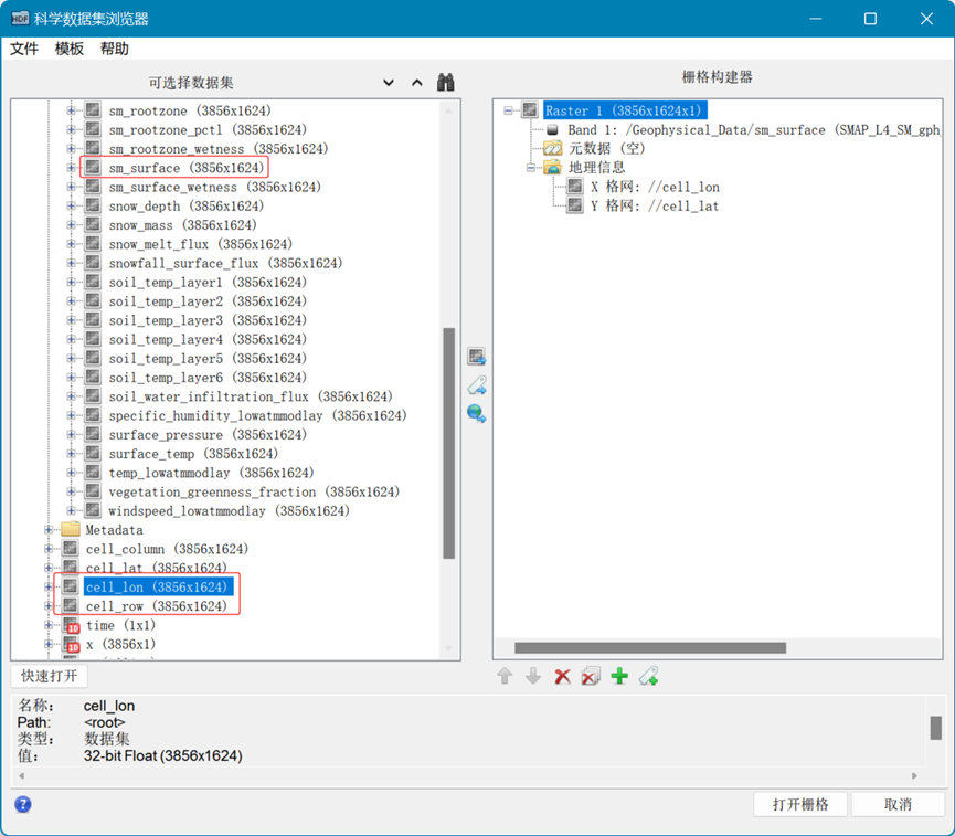 (1)文件->打开为->科学格式->HDF5,选择下载的L4_SM 产品,如这里的SMAP_L4_SM_gph_20250718T223000_Vv8011_001.h5。