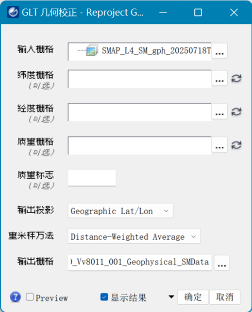 在Toolbox中,打开/几何校正/GLT 几何校正 (修正蝴蝶结效应)工具,选择上一步打开的数据,参数面板默认,进行地理定位处理。