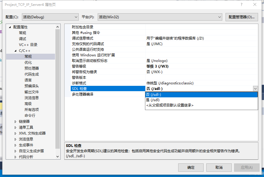 解决方法:项目---->项目属性---->c/c++--->-常规---->SDL检查选择“否”