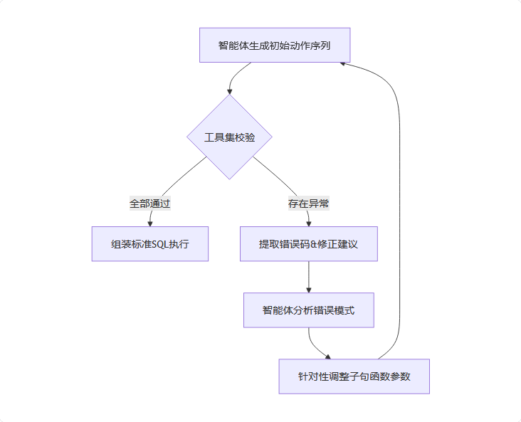 将SQL语法解耦为原子化子句(SELECT/WHERE/JOIN等),并为每个子句封装独立的Python函数,形成智能体的可执行动作库。智能体通过组合这些函数生成动作指令链,而非直接输出原始SQL语句。 - 沙盒化执行验证