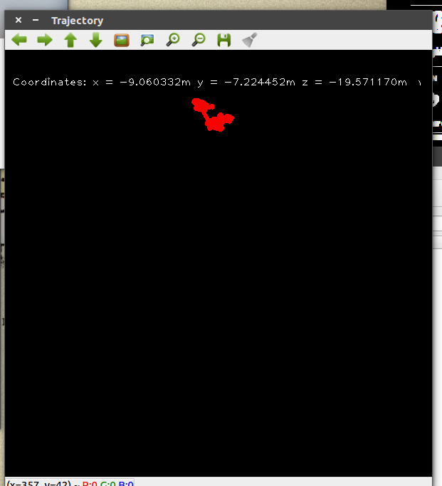 上图是我估计每六帧之间的R,t时绘制出来的轨迹,可以看到,一段时间内的轨迹均为直线。当然,由于我没有后端优化,所以当某一帧估计错误后,后面的轨迹会跟着继续,这也就是轨迹中折线部分的由来。