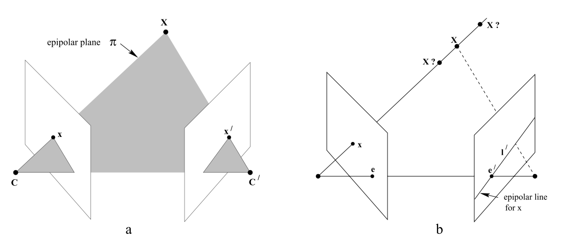 这里我们省去繁杂的推导,只需知道,如图a所示,对于空间点X,其在k时刻在相机平面上的投影为点x,在k+1时刻在相机平面上的投影为x',并且设k+1时刻相机相对于k时刻的坐标变换用R,t表示,则对极约束可以表示成: