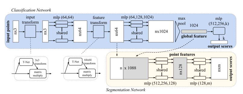 蓝色框中为做Classification任务的网络。红色为做Segmentation任务时的网络。