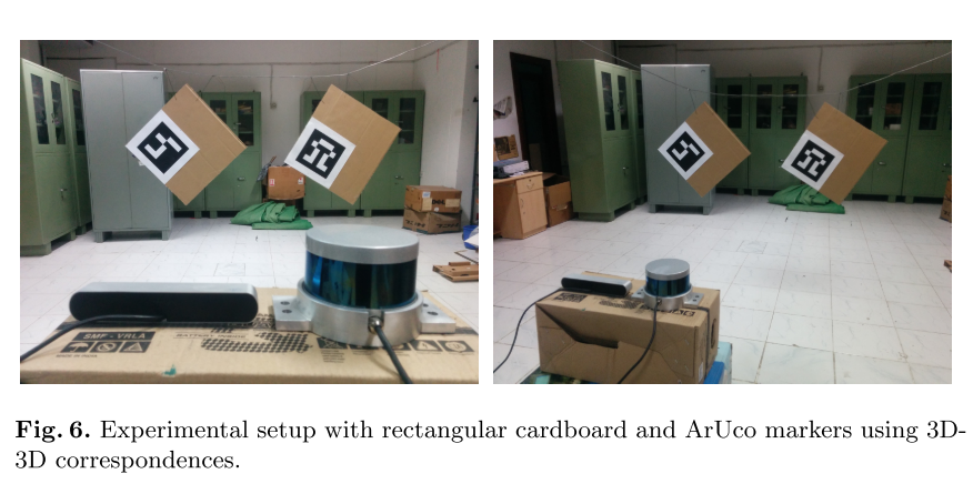 如图,左边是zed双目相机(当单目用),右边是VLP-16。两块硬纸板上装的是Aruco,类似于April tag,单目相机可以很容易通过PnP获得它自身坐标系到相机坐标系的R丨t。