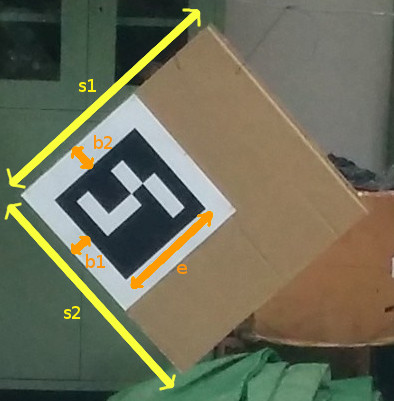 - 根据Aruco这个marker确定相机到Aruco坐标系的转换(原理为PnP),然后根据上图那些s1, s2, b1, b2, e等等量出来的距离,确定硬纸板四个角点在相机坐标系的三维坐标。