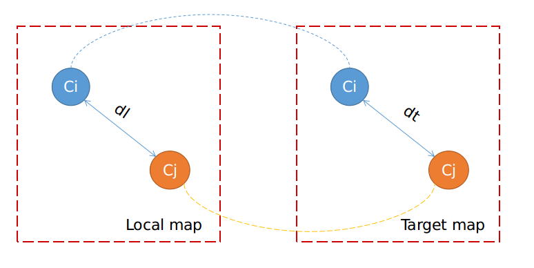 其中,\(d_l(c_i, c_j)\) 与\(d_t(c_i, c_j)\) 是在local map与target map中的两对聚类的中心店的距离。如下图所示。