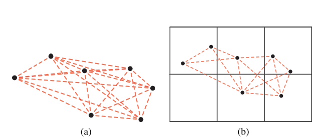 因此可以给每个聚类的中心获得一个栅格坐标。设栅格地图的每个格子的边长为\(b+\epsilon\),则保证了几何一致的聚类只可能在彼此相邻的栅格中,可以把原先的拓扑图快速优化成几何一致的拓扑图,如下图所示