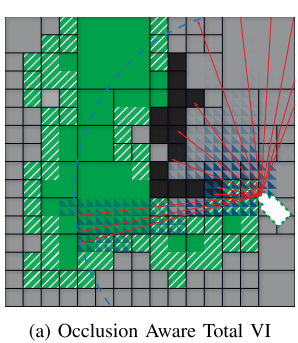 上图为根据OA 信息增益算出来的voxel的占据概率的信息增益图。其中,黑色表示该voxel已被占据,灰色表示该voxel未知,绿色表示该voxel为free。白色为待选的传感器未知。此外,边界区域的voxel被用白色斜线标出,信息增益的大小则用蓝色三角形的颜色深浅来表示。
