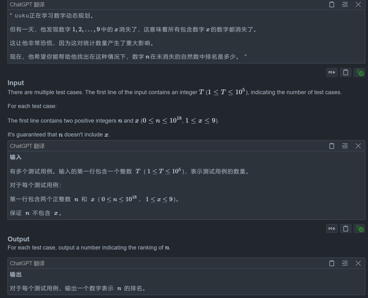 - 而k!=9的情况下,我们可以把n里面大于k的数位都减一(这个操作是不会改变数的顺序的),然后把处理过的n从九进制转为十进制即可。