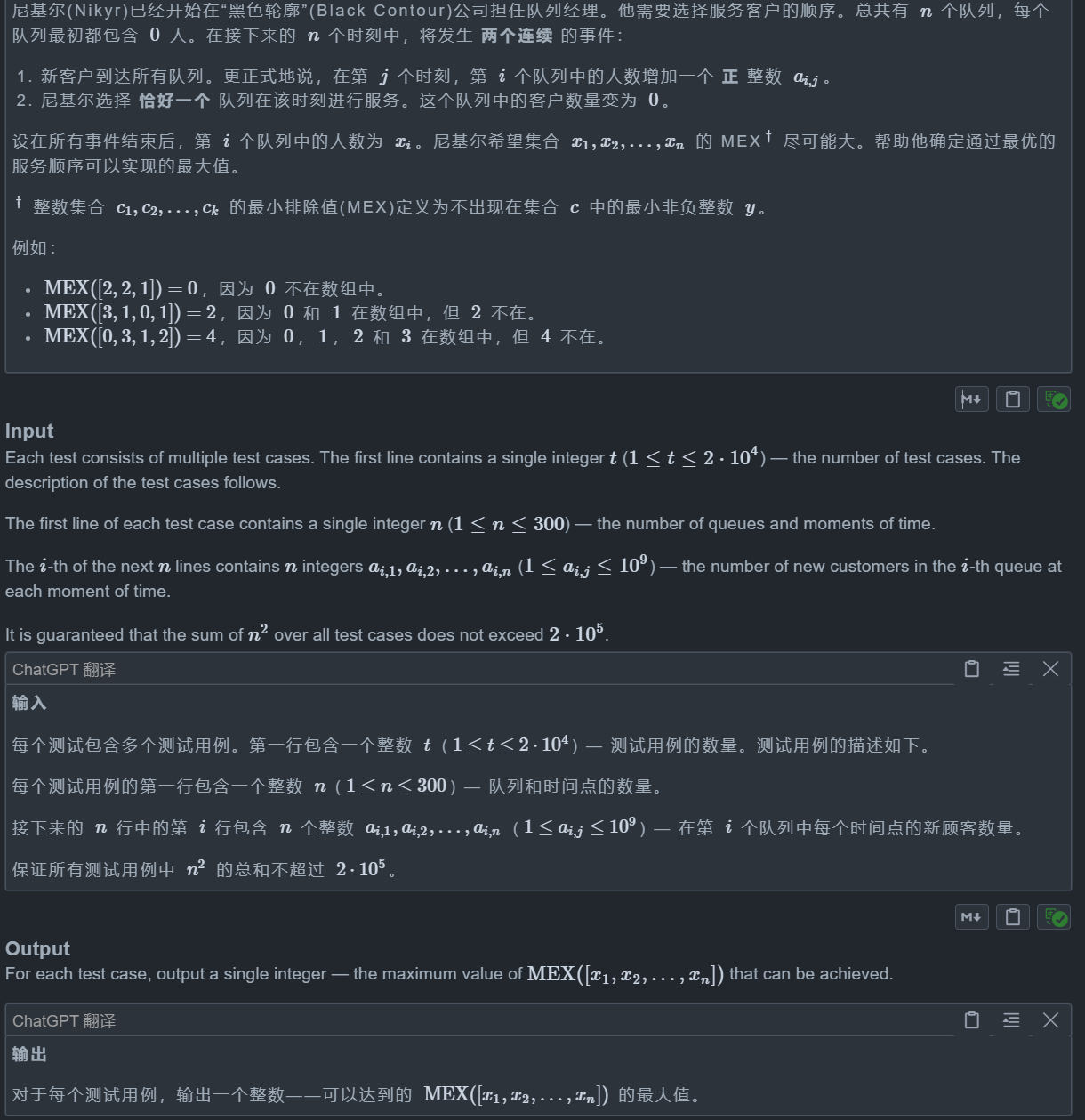 先处理出所有队列的增加序列的最后连续为 1 的个数,将它从小到大排序,依次看是否存在对应数量的连续 1 的个数。若不存在就可以直接输出答案