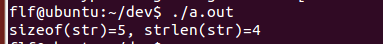 char str[] = "1234"; printf("sizeof(str)=%d, strlen(str)=%d\n", sizeof(str), strlen(str));