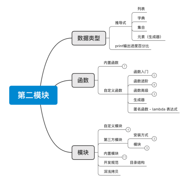 课程目标:对第二模块 “函数和模块” 阶段的知识点进行总结和考试,让学员更好的掌握此模块的相关知识。