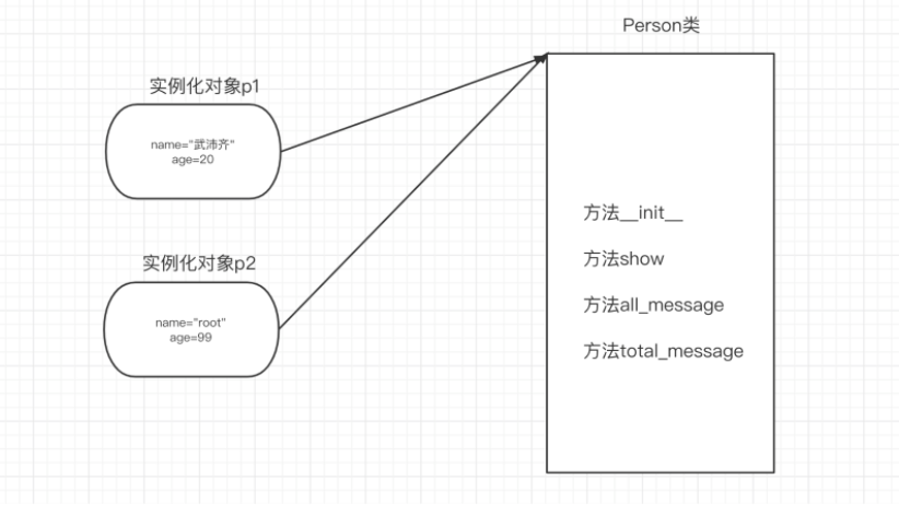 class Person: def __init__(self, n1, n2): # 实例变量 self.name = n1 self.age = n2 # 绑定方法 def show(self): msg = "我叫{},今年{}岁。".format(self.name, self.age) print(msg) def all_message(self): msg = "我是{}人,我叫{},今年{}岁。".format(Person.country, self.name, self.age) print(msg) def total_message(self): msg = "我是{}人,我叫{},今年{}岁。".format(self.country, self.name, self.age) print(msg)