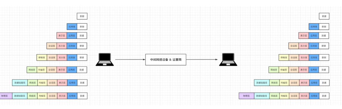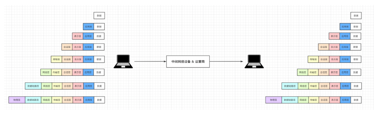 简单的可以理解为发快递:将数据外面套了7个箱子,最终用户收到箱子时需要打开7个箱子才能拿到数据。而在运输的过程中有些箱子是会被拆开并替换的,例如: