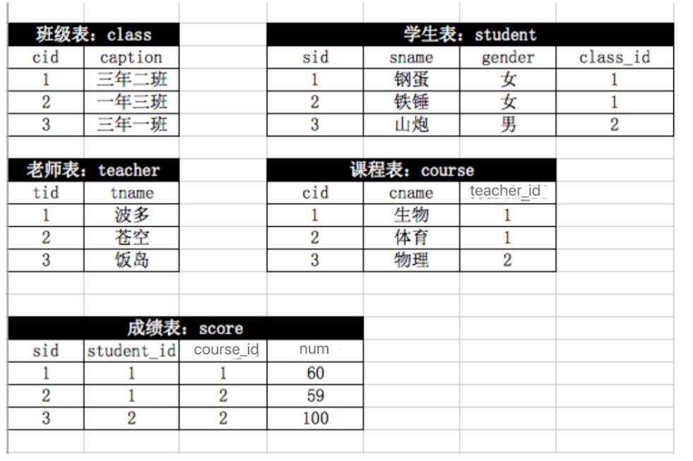 根据上图创建 数据库 & 表结构 并 录入数据(可以自行创造数据) create database day27db default charset utf8 collate utf8_general_ci; use day27db; drop database day27db; drop database IF EXISTS day27db; 利用导入数据库命令: 导入 mysql -u root -p day27db < /Users/wupeiqi/day27db.sql 导出 # 结构+数据 mysqldump -u root -p day27db > /Users/wupeiqi/day27db2.sql # 结构 mysqldump -u root -p -d day27db > /Users/wupeiqi/day27db3.sql create table class( cid int not null auto_increment primary key, caption varchar(16) not null )default charset=utf8; INSERT INTO class VALUES ('1', '三年二班'), ('2', '三年三班'), ('3', '一年二班'), ('4', '二年九班'); create table student( sid int not null auto_increment primary key, gender char(1) not null, class_id int not null, sname varchar(16) not null, constraint fk_student_class foreign key (class_id) references class(cid) )default charset=utf8; INSERT INTO student VALUES ('1', '男', '1', '理解'), ('2', '女', '1', '钢蛋'), ('3', '男', '1', '张三'), ('4', '男', '1', '张一'), ('5', '女', '1', '张二'), ('6', '男', '1', '张四'), ('7', '女', '2', '铁锤'), ('8', '男', '2', '李三'), ('9', '男', '2', '李一'), ('10', '女', '2', '李二'), ('11', '男', '2', '李四'), ('12', '女', '3', '如花'), ('13', '男', '3', '刘三'), ('14', '男', '3', '刘一'), ('15', '女', '3', '刘二'), ('16', '男', '3', '刘四'); create table teacher( tid int not null auto_increment primary key, tname varchar(16) not null )default charset=utf8; INSERT INTO `teacher` VALUES ('1', '张磊老师'), ('2', '李平老师'), ('3', '刘海燕老师'), ('4', '朱云海老师'), ('5', '李杰老师'); create table course( cid int not null auto_increment primary key, cname varchar(16) not null, teacher_id int not null, constraint fk_course_teacher foreign key (teacher_id) references teacher(tid) )default charset=utf8; INSERT INTO `course` VALUES ('1', '生物', '1'), ('2', '物理', '2'), ('3', '体育', '3'), ('4', '美术', '2'); CREATE TABLE `score` ( `sid` int NOT NULL AUTO_INCREMENT PRIMARY KEY, `student_id` int NOT NULL, `course_id` int NOT NULL, `num` int NOT NULL, CONSTRAINT `fk_score_course` FOREIGN KEY (`course_id`) REFERENCES `course` (`cid`), CONSTRAINT `fk_score_student` FOREIGN KEY (`student_id`) REFERENCES `student` (`sid`) ) DEFAULT CHARSET=utf8; INSERT INTO `score` VALUES ('1', '1', '1', '10'), ('2', '1', '2', '9'), ('5', '1', '4', '66'), ('6', '2', '1', '8'), ('8', '2', '3', '68'), ('9', '2', '4', '99'), ('10', '3', '1', '77'), ('11', '3', '2', '66'), ('12', '3', '3', '87'), ('13', '3', '4', '99'), ('14', '4', '1', '79'), ('15', '4', '2', '11'), ('16', '4', '3', '67'), ('17', '4', '4', '100'), ('18', '5', '1', '79'), ('19', '5', '2', '11'), ('20', '5', '3', '67'), ('21', '5', '4', '100'), ('22', '6', '1', '9'), ('23', '6', '2', '100'), ('24', '6', '3', '67'), ('25', '6', '4', '100'), ('26', '7', '1', '9'), ('27', '7', '2', '100'), ('28', '7', '3', '67'), ('29', '7', '4', '88'), ('30', '8', '1', '9'), ('31', '8', '2', '100'), ('32', '8', '3', '67'), ('33', '8', '4', '88'), ('34', '9', '1', '91'), ('35', '9', '2', '88'), ('36', '9', '3', '67'), ('37', '9', '4', '22'), ('38', '10', '1', '90'), ('39', '10', '2', '77'), ('40', '10', '3', '43'), ('41', '10', '4', '87'), ('42', '11', '1', '90'), ('43', '11', '2', '77'), ('44', '11', '3', '43'), ('45', '11', '4', '87'), ('46', '12', '1', '90'), ('47', '12', '2', '77'), ('48', '12', '3', '43'), ('49', '12', '4', '87'), ('52', '13', '3', '87'); 创建用户 luffy 并赋予此数据库的所有权限。 create user 'luffy'@'%' identified by 'root123'; grant all privileges on day27db.* TO 'luffy'@'%'; flush privileges; 查询姓“李”的老师的个数。 select count(*) from teacher where tname like "李%"; 查询姓“张”的学生名单。 select * from student where sname like "张%"; 查询男生、女生的人数。 select gender,count(1) from student group by gender; 查询同名同姓学生名单,并统计同名人数。 select sname,count(1) from student group by sname; select sname,count(1) from student group by sname having count(1) > 1; 查询 “三年二班” 的所有学生。 select * from student left join class on student.class_id = class.cid where class.caption="三年二班"; 查询 每个 班级的 班级名称、班级人数。 select class_id,count(1) from student group by class_id; select class.caption,count(1) from student left join class on student.class_id = class.cid group by class.caption; 查询成绩小于60分的同学的学号、姓名、成绩、课程名称。 select * from score where num <60; select student.sid, student.sname, score.num, course.cname from score left join student on score.student_id=student.sid left join course on score.course_id =course.cid where num <60; 查询选修了 “生物课” 的所有学生ID、学生姓名、成绩。 select * from score left join course on score.course_id =course.cid where course.cname="生物"; select student.sid, student.sname, score.num from score left join course on score.course_id =course.cid left join student on score.student_id=student.sid where course.cname="生物"; 查询选修了 “生物课” 且分数低于60的的所有学生ID、学生姓名、成绩。 select student.sid,student.sname,score.num from score left join course on score.course_id =course.cid left join student on score.student_id=student.sid where course.cname="生物" and score.num < 60; 查询所有同学的学号、姓名、选课数、总成绩。 select student_id,count(1),sum(num) from score group by student_id; select student_id,student.sname,count(1),sum(num) from score left join student on score.student_id=student.sid group by student_id; 查询各科被选修的学生数。 select course_id,count(1) from score group by course_id; select course_id,course.cname,count(1) from score left join course on score.course_id =course.cid group by course_id; 查询各科成绩的总分、最高