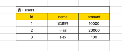 mysql> select * from users; +----+---------+---------+ | id | name | amount | +----+---------+---------+ | 1 | wupeiqi | 5 | | 2 | alex | 6 | +----+---------+---------+ 3 rows in set (0.00 sec) mysql> begin; -- 开启事务 start transaction; Query OK, 0 rows affected (0.00 sec) mysql> update users set amount=amount-2 where id=1; -- 执行操作 Query OK, 1 row affected (0.00 sec) Rows matched: 1 Changed: 1 Warnings: 0 mysql> update users set amount=amount+2 where id=2; -- 执行操作 Query OK, 1 row affected (0.00 sec) Rows matched: 1 Changed: 1 Warnings: 0 mysql> commit; -- 提交事务 rollback; Query OK, 0 rows affected (0.00 sec) mysql> select * from users; +----+---------+---------+ | id | name | amount | +----+---------+---------+ | 1 | wupeiqi | 3 | | 2 | ale x | 8 | +----+---------+---------+ 3 rows in set (0.00 sec) mysql> select * from users; +----+---------+---------+ | id | name | amount | +----+---------+---------+ | 1 | wupeiqi | 3 | | 2 | ale x | 8 | +----+---------+---------+ 3 rows in set (0.00 sec) mysql> begin; -- 开启事务 Query OK, 0 rows affected (0.00 sec) mysql> update users set amount=amount-2 where id=1; -- 执行操作(此时数据库中的值已修改) Query OK, 1 row affected (0.00 sec) Rows matched: 1 Changed: 1 Warnings: 0 mysql> rollback; -- 事务回滚(回到原来的状态) Query OK, 0 rows affected (0.00 sec) mysql> select * from users; +----+---------+---------+ | id | name | amount | +----+---------+---------+ | 1 | wupeiqi | 3 | | 2 | ale x | 8 | +----+---------+---------+ 3 rows in set (0.00 sec)
