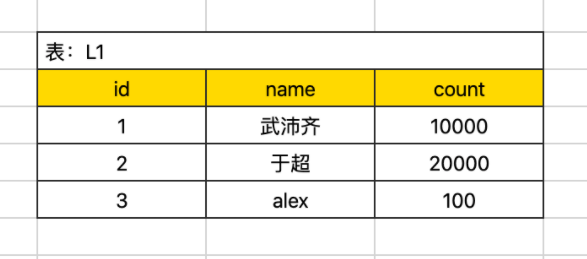 CREATE TABLE `L1` ( `id` int(11) NOT NULL AUTO_INCREMENT, `name` varchar(255) DEFAULT NULL, `count` int(11) DEFAULT NULL, PRIMARY KEY (`id`) ) ENGINE=InnoDB DEFAULT CHARSET=utf8;