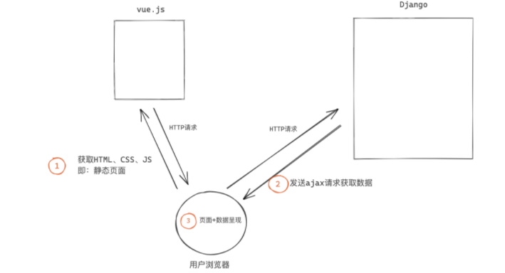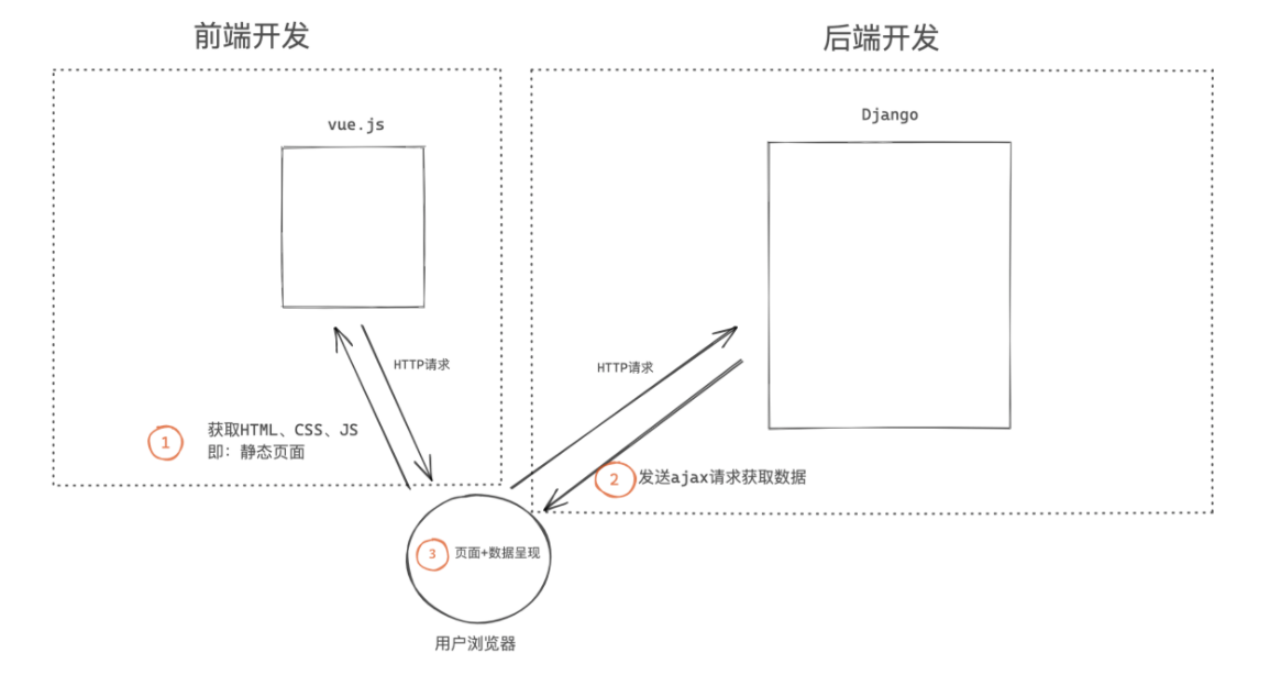 前后端职责清晰,前端开发者只vue.js、react.js、angular.js等框架编写页面;后端开发者只用Python编写后端代码;(两者通过json格式请求数据的传输)。