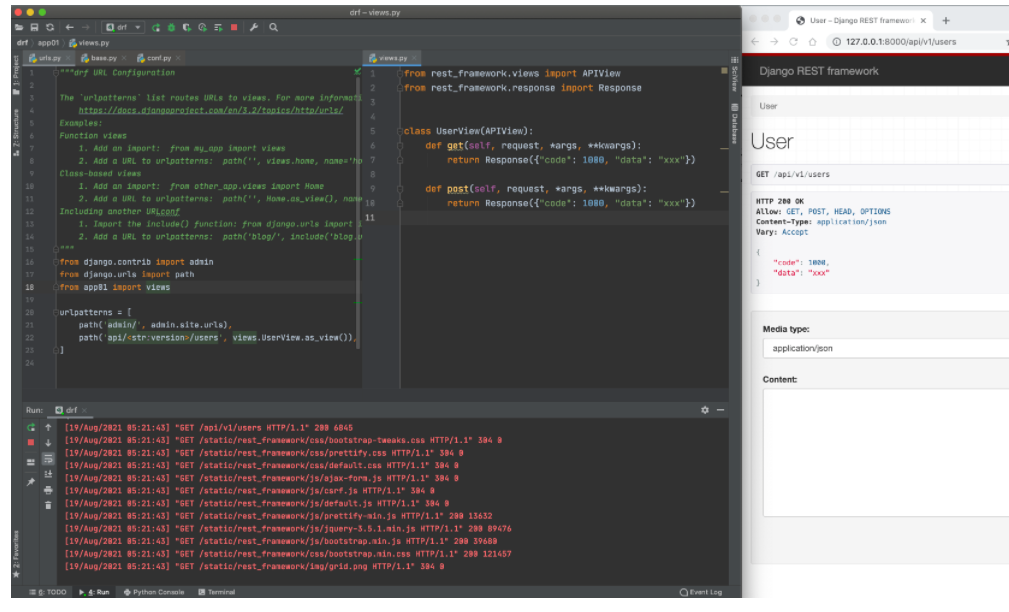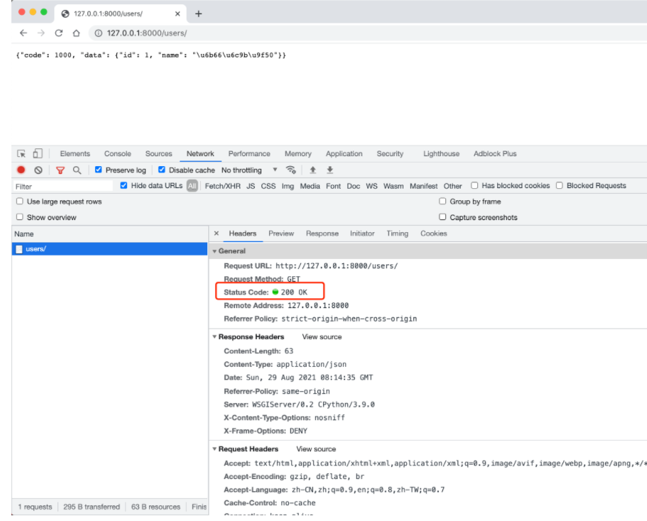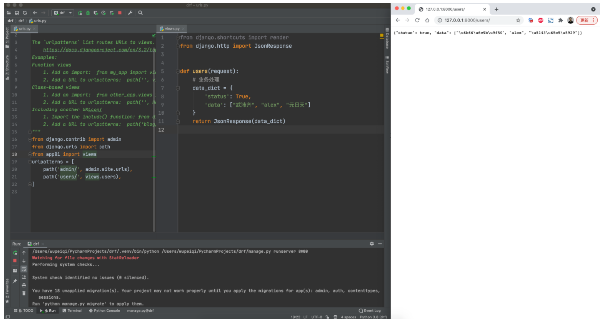 from django.contrib import admin from django.urls import path from app01 import views urlpatterns = [ path('users/', views.users), ] from django.http import JsonResponse def users(request,*args, **kwargs): if request.method == "GET": return JsonResponse({"code":1000,"data":"xxx"}) elif request.method == 'POST': return JsonResponse({"code":1000,"data":"xxx"}) ...