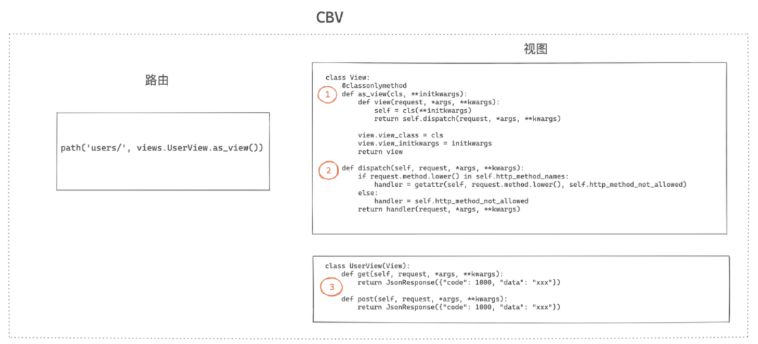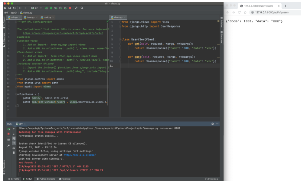 from django.contrib import admin from django.urls import path from app01 import views urlpatterns = [ path('users/', views.UserView.as_view()), ] from django.views import View # 需要继承view class UserView(View): def get(self, request, *args, **kwargs): return JsonResponse({"code": 1000, "data": "xxx"}) def post(self, request, *args, **kwargs): return JsonResponse({"code": 1000, "data": "xxx"})