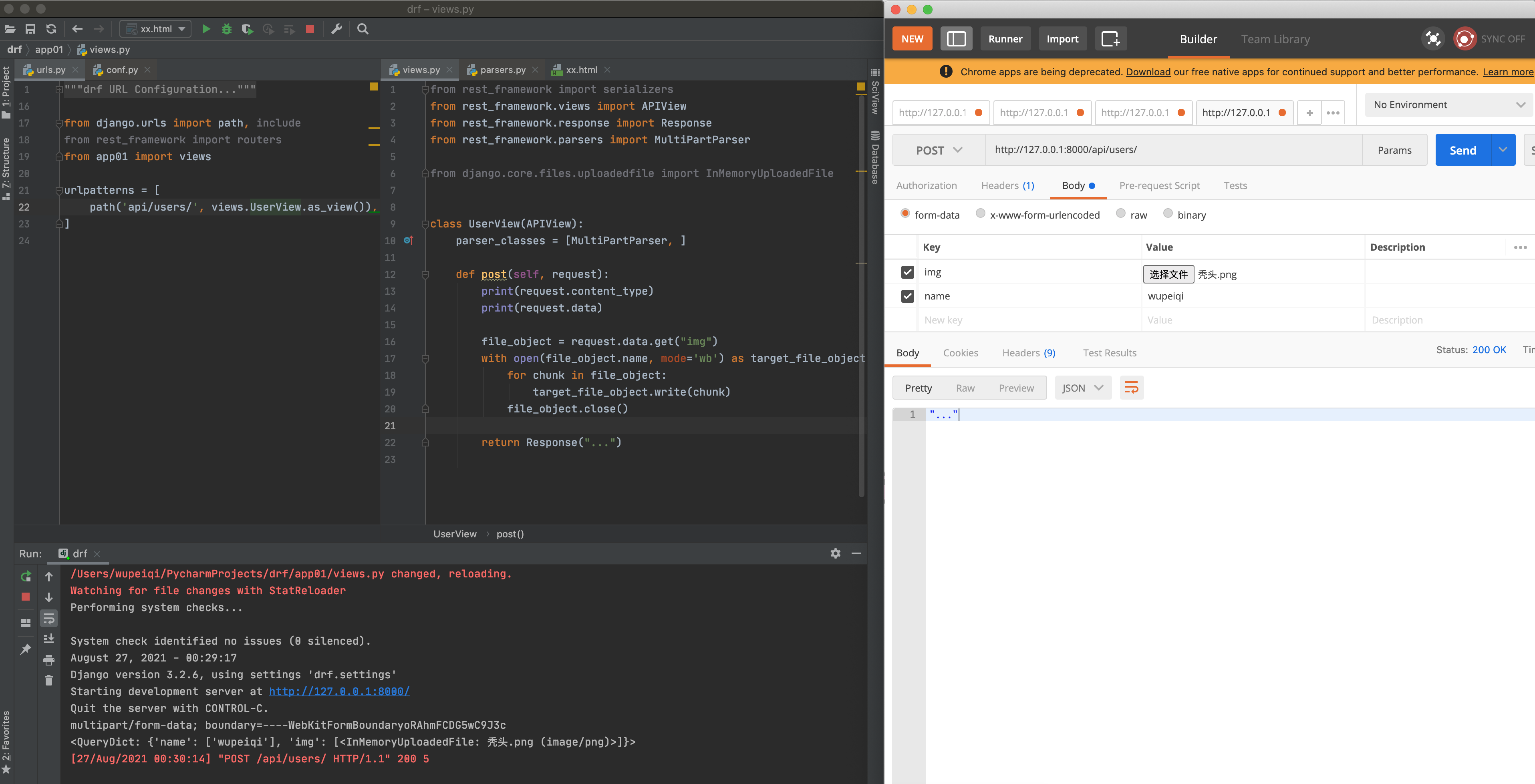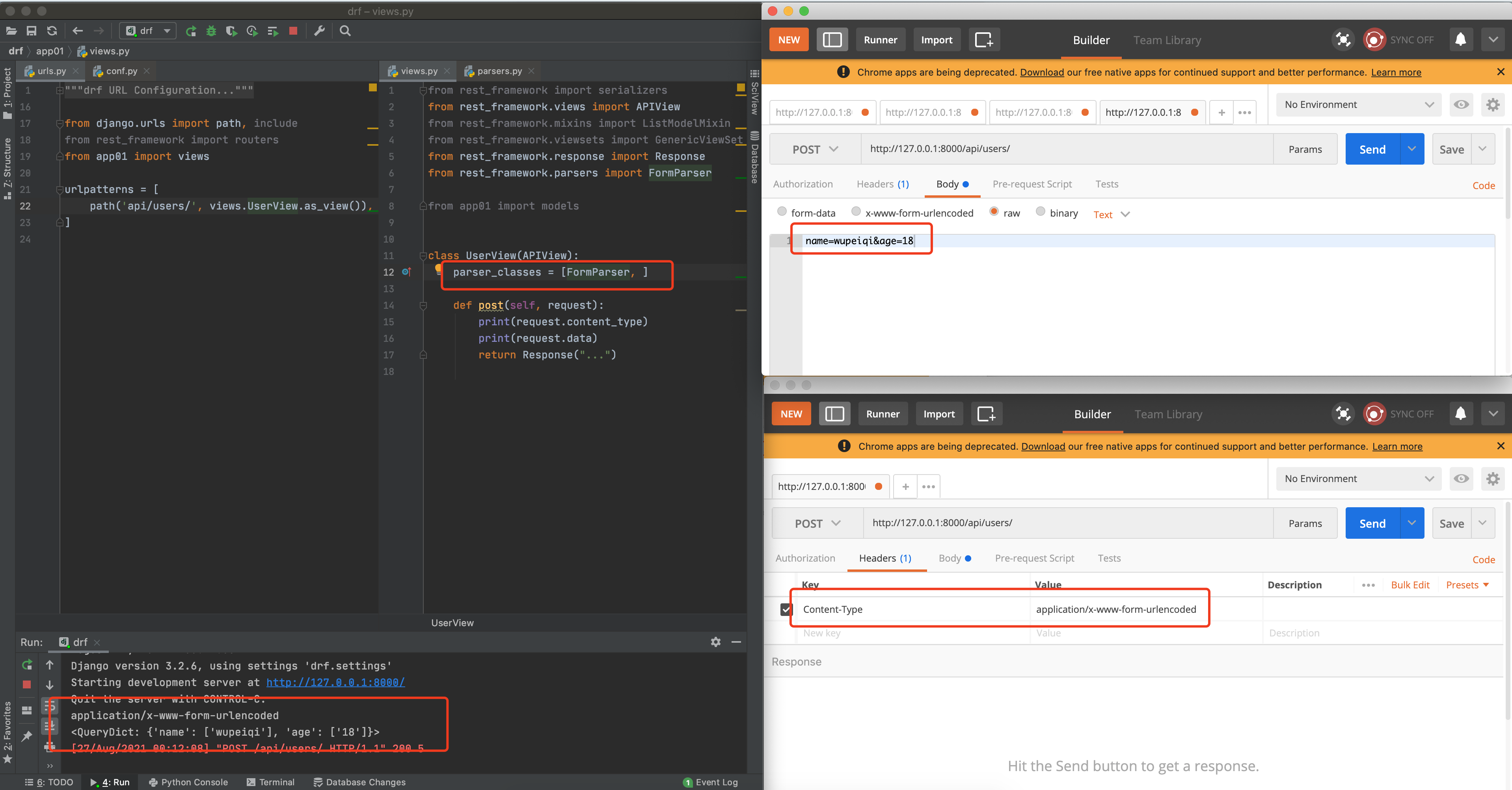 这个 reqeust.data 的数据怎么来的呢?其实在drf内部是由 解析器,根据请求者传入的数据格式 + 请求头来进行处理。